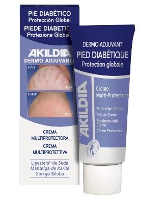 La Crema Multiprotectora AKILDIA® asegura una protección completa de la epidermis de los pies diabéticos. Hidrata intensamente, refuerza su función de barrera y elimina las callosidades. Al estimular la microcirculación sanguínea ayuda a los pies a encontrar su sensibilidad. La Crema Multiprotectora AKILDIA®, dotada de agentes antibacterianos y antifúngicos, previene además las nefastas agresiones exteriores de los pies. Gracias a su especial activo (Glistin®), protege las células de la neurodegeneración.