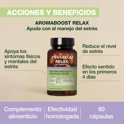 Diseñado para ayudar en la gestión del estrés ocasional, Aromaboost RELAX ofrece una solución duradera para apoyar los signos mentales y físicos del estrés.Ideal durante períodos de intensa tensión nerviosa o para superar la ansiedad ocasional, este complemento alimenticio sin riesgo de dependencia ofrece una mejor gestión del estrés ocasional a largo plazo, con una cura recomendada de 1 mes.