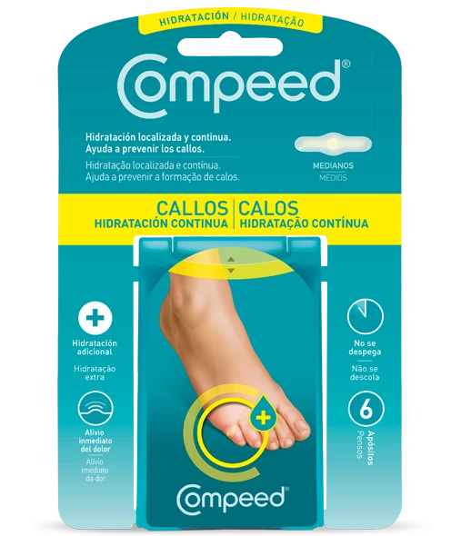 COMPEED CALLOS HIDRATACIÓN CONTINUA está diseñado para suavizar y reducir la aparición de callos mediante una fórmula que proporciona una hidratación intensa y prolongada. Gracias a su tecnología avanzada, los parches se adhieren cómodamente a la piel, creando un ambiente óptimo para la regeneración celular y aliviando la presión y el dolor en las áreas afectadas.