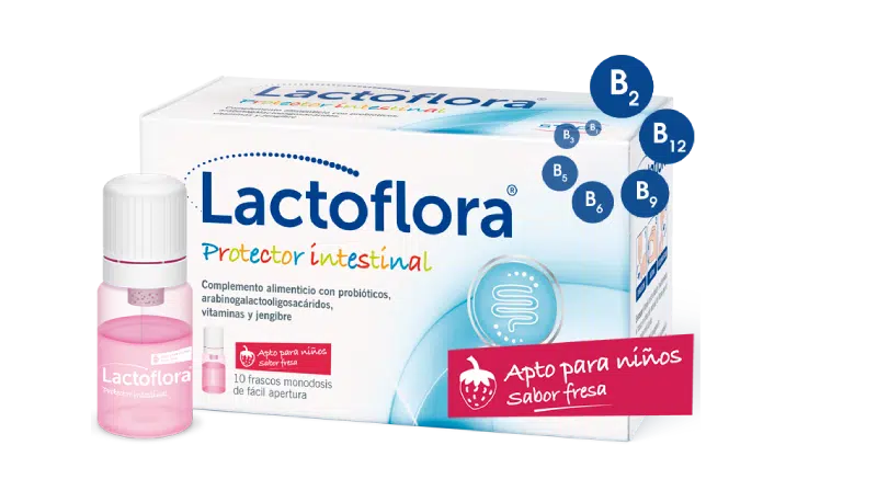 Lactoflora® protector intestinal infantil es un simbiótico (mezcla de probióticos y fibra prebiótica) con vitaminas y jengibre. Las vitaminas B6, B12 y el ácido fólico contribuyen al normal funcionamiento del sistema inmunitario. El jengibre contribuye al mantenimiento del bienestar gastrointestinal.